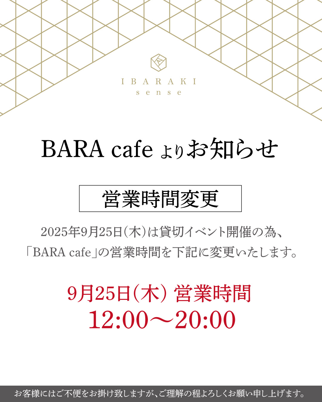 2025年9月25日(木)は貸切イベント開催の為、「BARA cafe」の営業時間を下記に変更いたします。