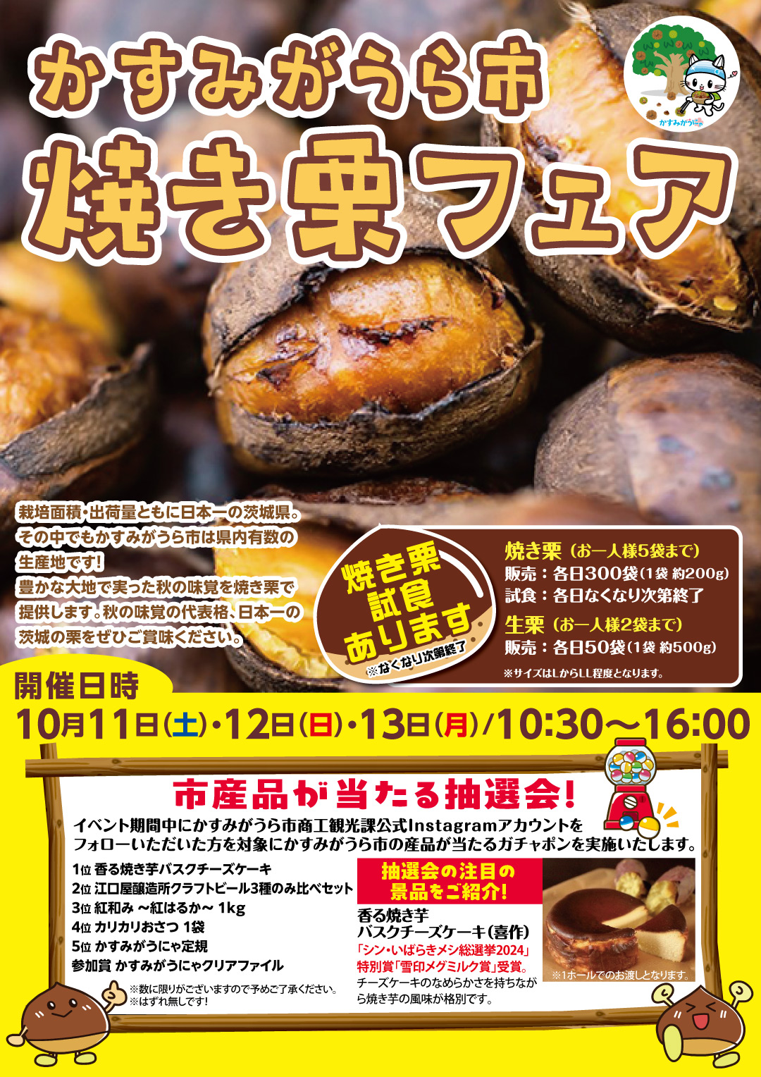 IBARAKI senseでは、3日間限定で、栽培面積・出荷量ともに日本一を誇る茨城の栗を紹介する「かすみがうら市 焼き栗フェア」を開催します!