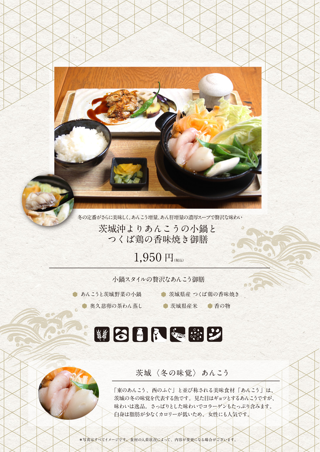 『茨城沖よりあんこうの小鍋と つくば鶏の香味焼き御膳』