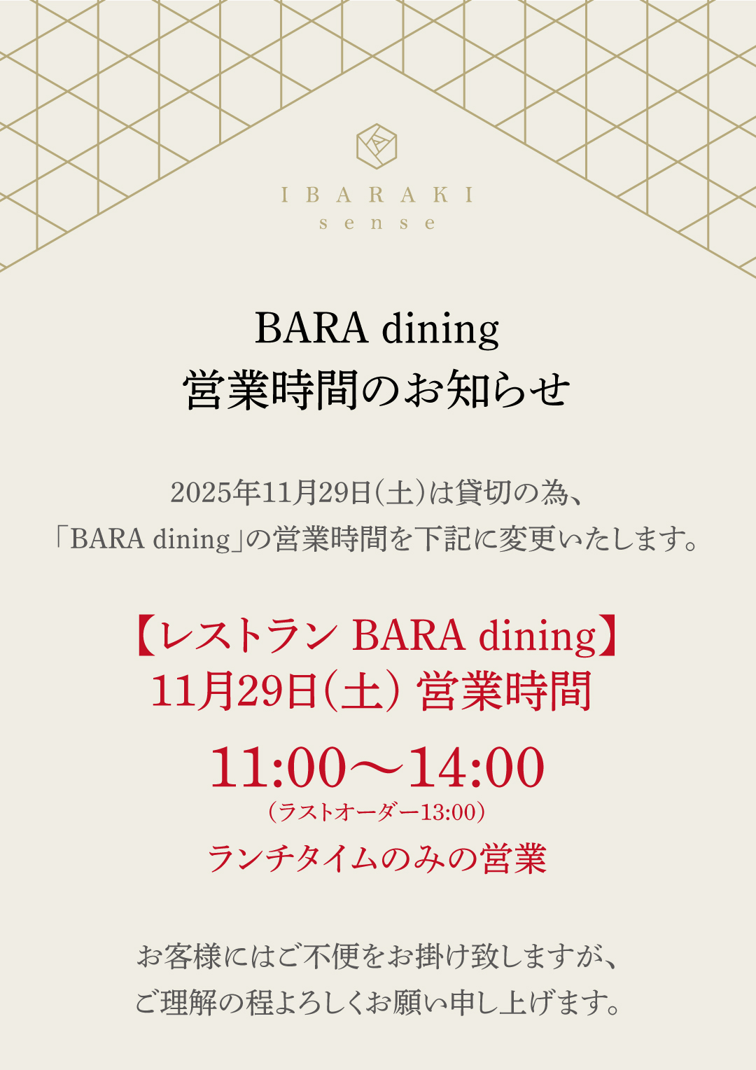 2025年11月29日(土)は、「BARA dining」の営業時間を下記の通り変更いたします。