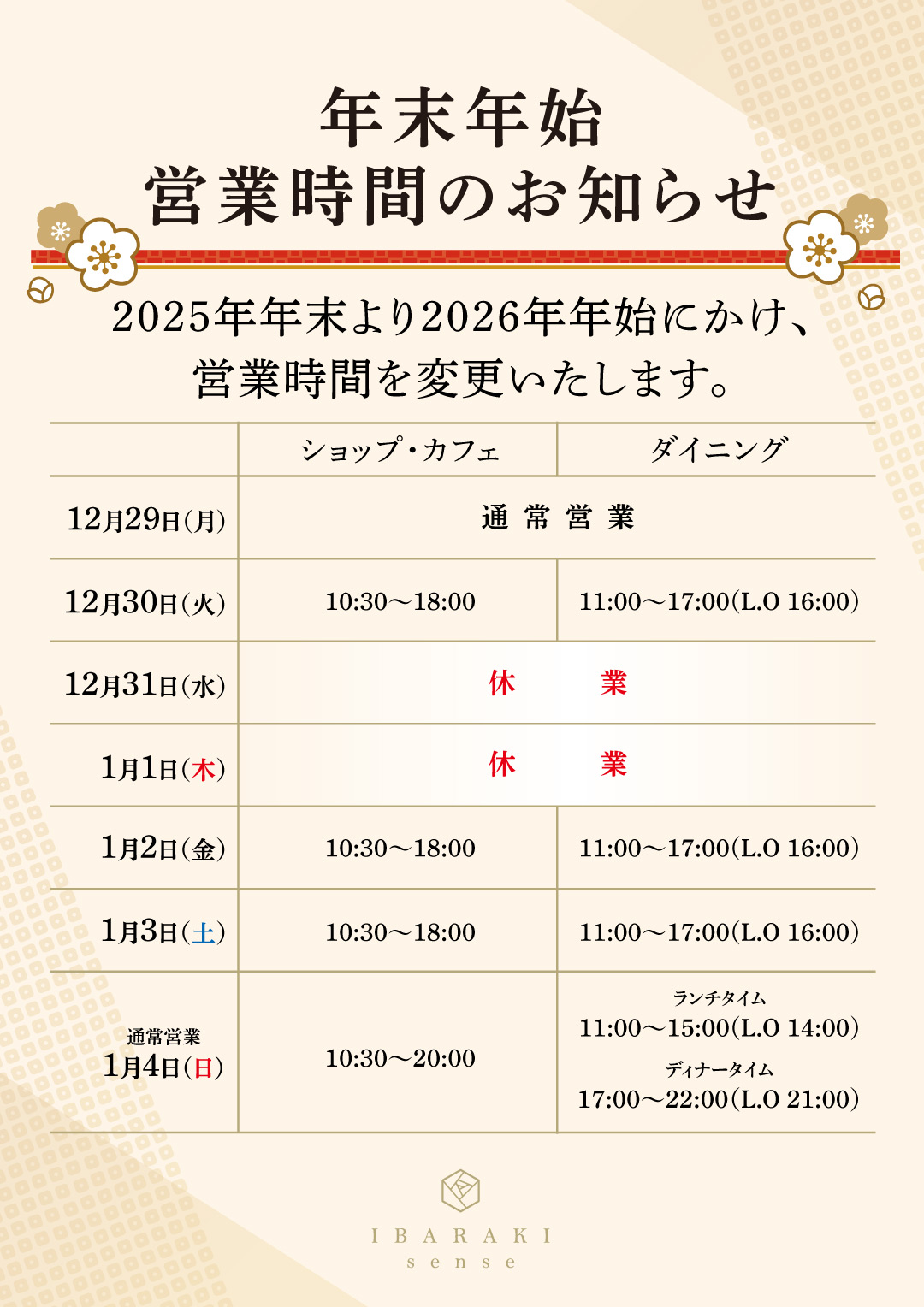 2025年の年末から2026年の年始にかけて、営業時間を以下の通り変更いたします。